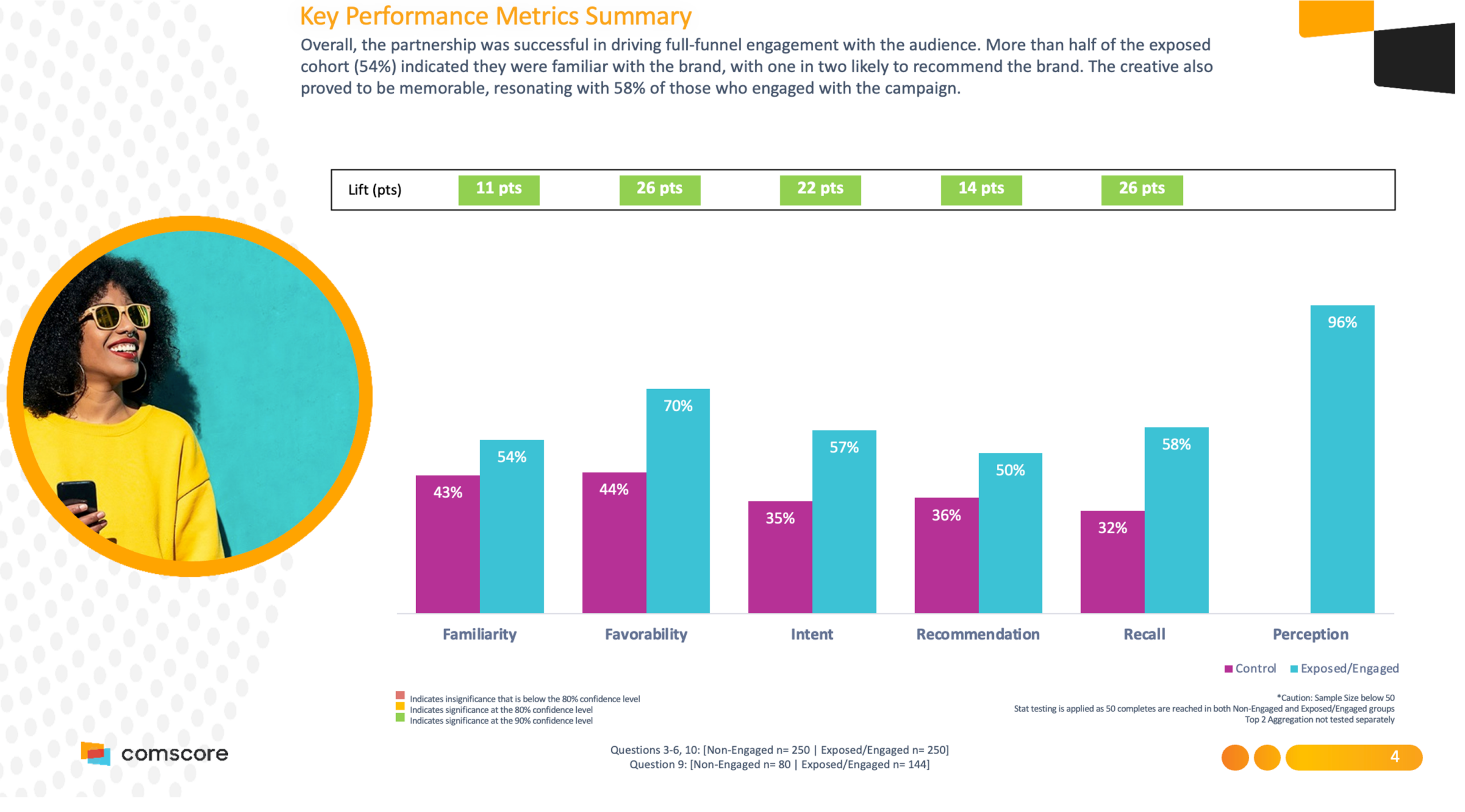 Grazie alla Social Brand Lift, Comscore ha dimostrato incrementi significativi in tutti i KPI di funnel — favorability, purchase intent, brand interest — permettendo ai publisher e ai brand di valorizzare il proprio impatto.