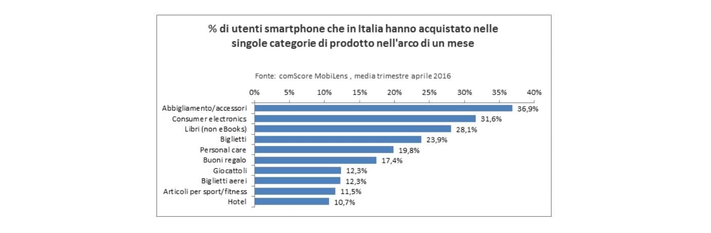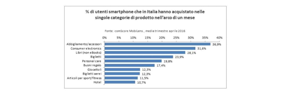 A beneficiare della maggiore propensione degli Italiani agli acquisti via smartphone è il settore del fashion. Abbigliamento e accessori sono i prodotti che più Mobile Shopper hanno dichiarato di aver acquistato ad aprile 2016 (oltre il 35% degli utenti).