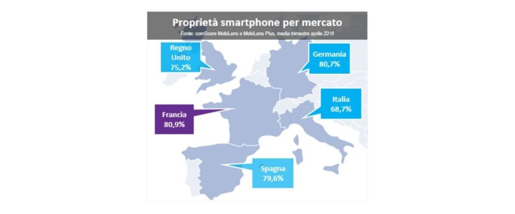 In Francia e Germania si registrano le percentuali di possessori di smartphone più elevate nei mercati EU5; nel mese di aprile 2016, le loro audience hanno infatti toccato quota 80%.