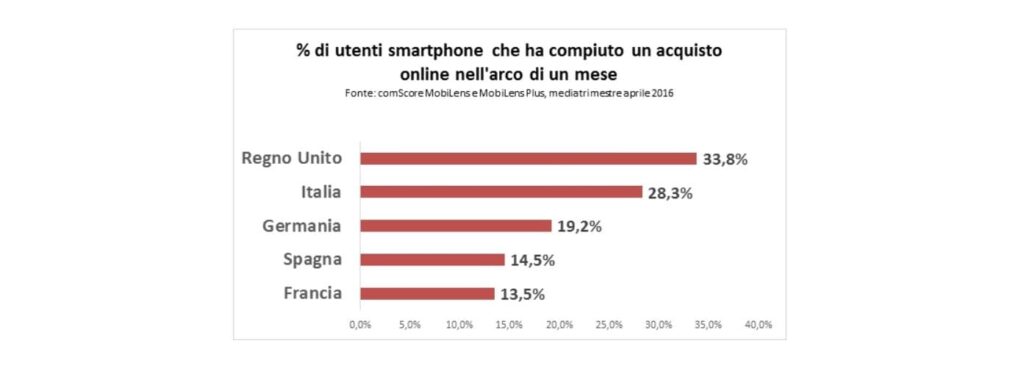 Ma se i dati sul possesso di smartphone risultano particolarmente elevati, gli europei si sono imposti anche come assidui Mobile Shopper. Nel Regno Unito, gli utenti smartphone che hanno anche effettuato almeno un acquisto online sono stati oltre un terzo nel mese di aprile, seguiti proprio dall’Italia.
