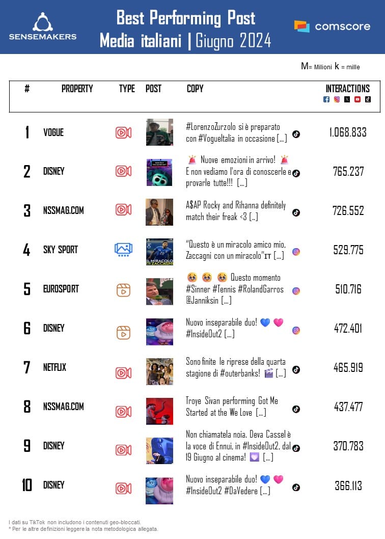 Questa classifica evidenzia la diversità degli interessi del pubblico italiano sui social media, spaziando dalla moda allo sport, fino all’intrattenimento per famiglie. Sky Sport, in particolare, continua a dimostrarsi un player chiave nel settore dei contenuti sportivi online, con un post altamente performante che conferma il suo forte legame con il pubblico.