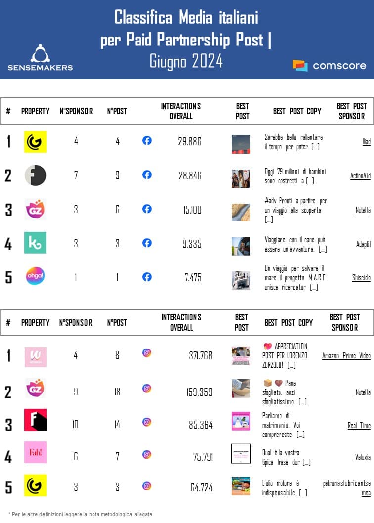Dall’analisi dei dati della classifica delle Best Paid Partnership, emerge chiaramente la capacità di Giallozafferano di mantenere una posizione di rilievo su entrambe le piattaforme, nonostante le fluttuazioni nel numero di interazioni e di post pubblicati. Fanpage mostra una notevole crescita su Facebook, passando dal quinto al secondo posto, mentre Webboh dimostra un incremento significativo su Instagram, conquistando la prima posizione a giugno con un aumento considerevole delle interazioni (più del doppio).