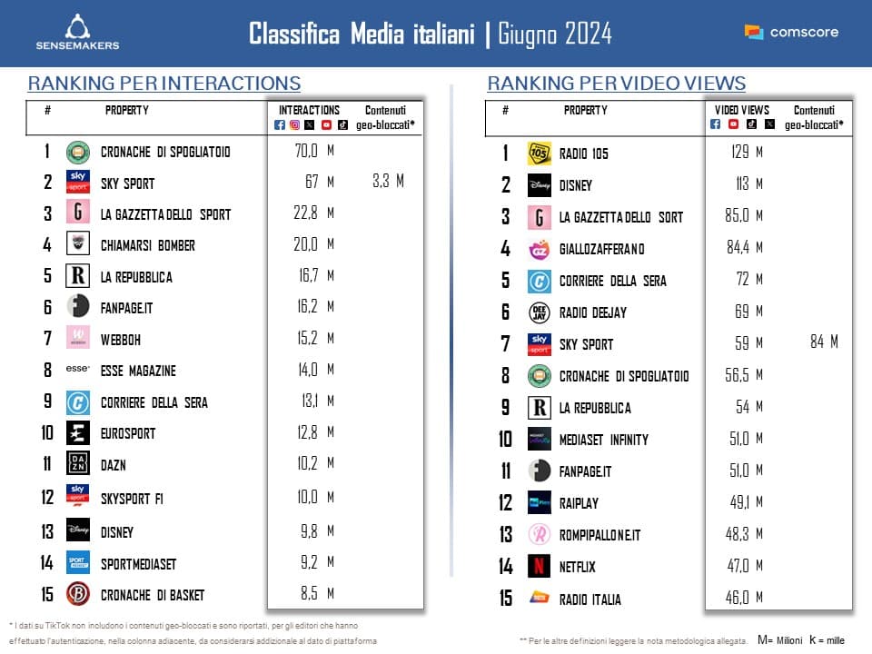 Ora disponibile la classifica dei Top 15 Media italiani di giugno, elaborata da Sensemakers in collaborazione con Prima online sulla base dei dati Comscore Social.
