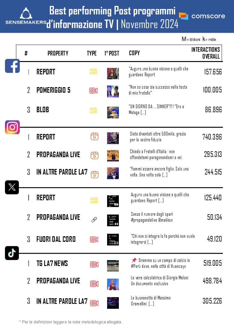 La classifica dei Best Performing Post è dominata dai contenuti di Report e Propaganda Live, quest’ultimo presente in tre delle quattro piattaforme in analisi.