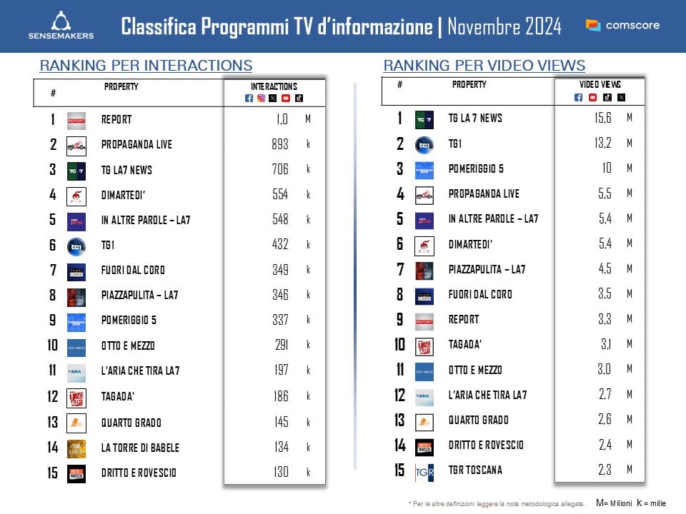 Pubblicata la classifica dei Top Programmi TV d’Informazione più attivi sui social a novembre, elaborata da Sensemakers in collaborazione con Prima Comunicazione, sulla base dei dati Comscore Social rilevati monitorando interazioni e video views sulle principali piattaforme social.