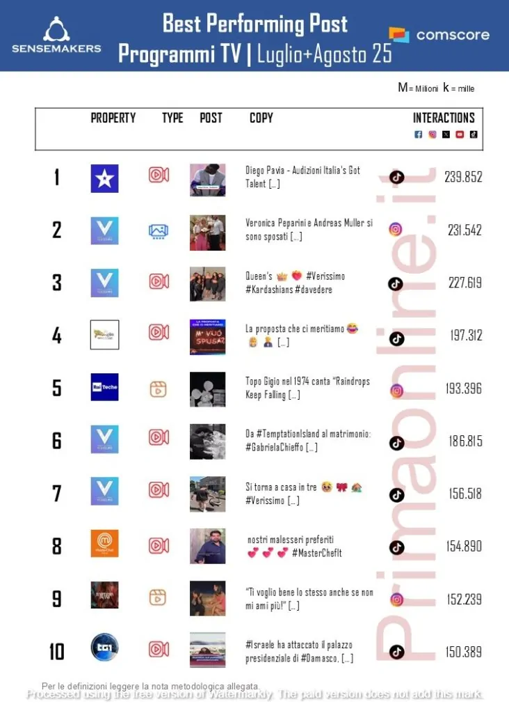 Best Performing post Programmi TV per interazioni a Luglio e Agosto