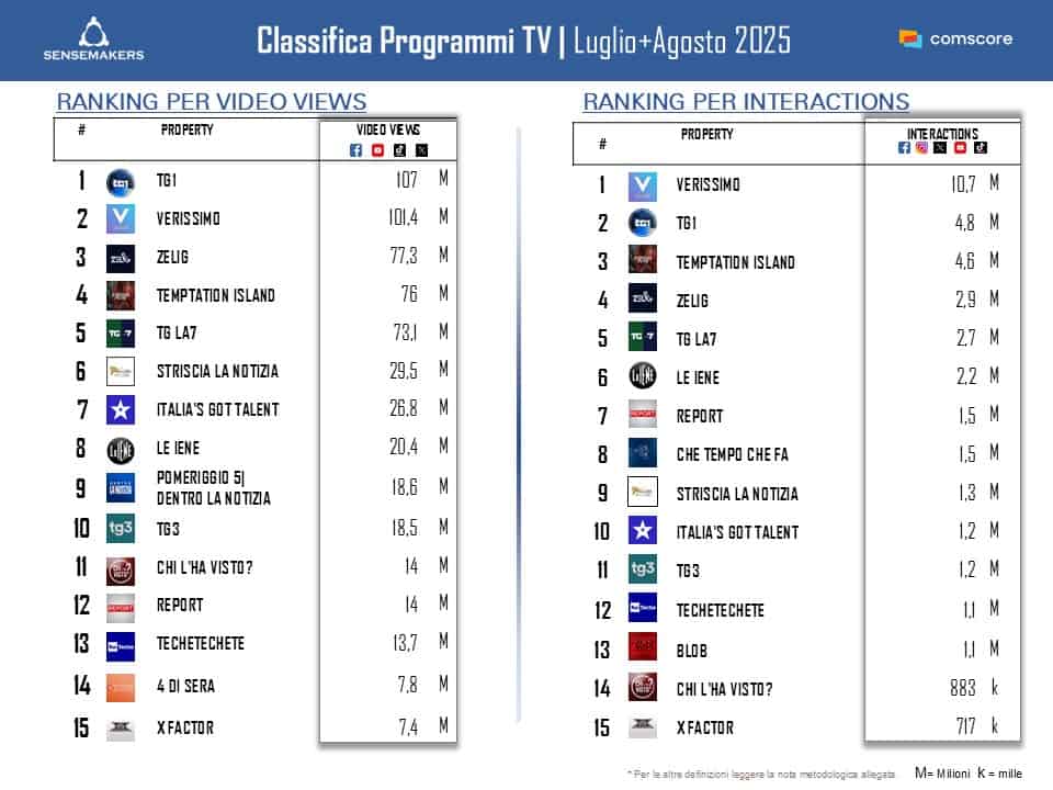 TOP 15 Programmi TV più attivi sui social, Luglio e Agosto 2025