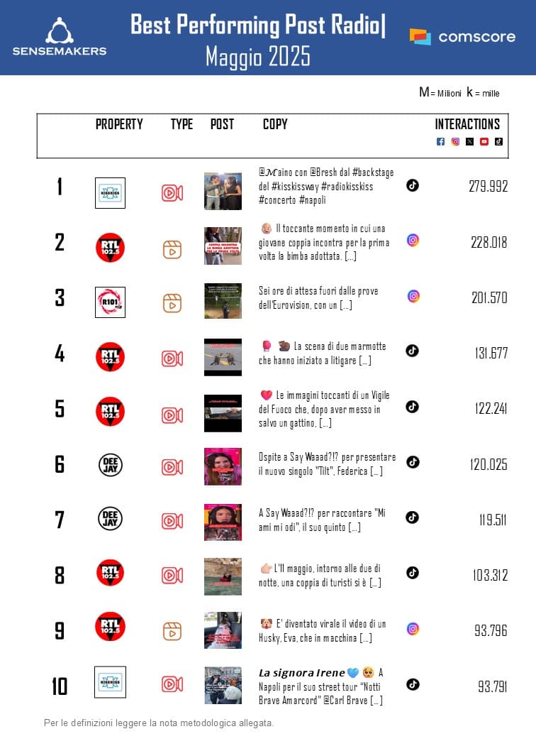 Crescita rilevante e trasversale anche per Radio KissKiss (+120% per views e +131% per interazioni), che il 31 maggio ha inaugurato a Napoli la prima tappa del “Kiss Kiss Way Tour”. È interessante osservare come, in termini di engagement, i contenuti più performanti si concentrino su TikTok, che da sola genera oltre il 50% del volume complessivo di interazioni. Per quanto riguarda le visualizzazioni video, invece, si segnala anche una buona performance di alcuni contenuti su Facebook, che rappresentano il 44% del totale delle views.
