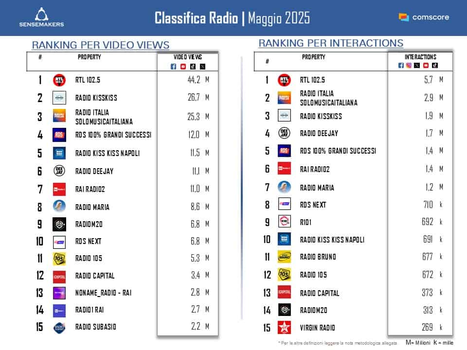 Classifica delle Top Radio Italiane per interazioni e video views sui contenuti pubblicati nel mese di riferimento.