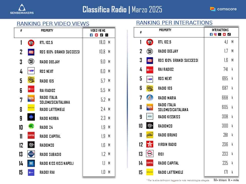 RTL 102.5 riprende il primo posto sia per video views che per interazioni, sebbene con una significativa contrazione dei volumi rispetto a febbraio (di 3 volte quelli di video views e del -60% quelli d’engagement); una tendenza che si riscontra anche per le altre emittenti presenti in classifica.