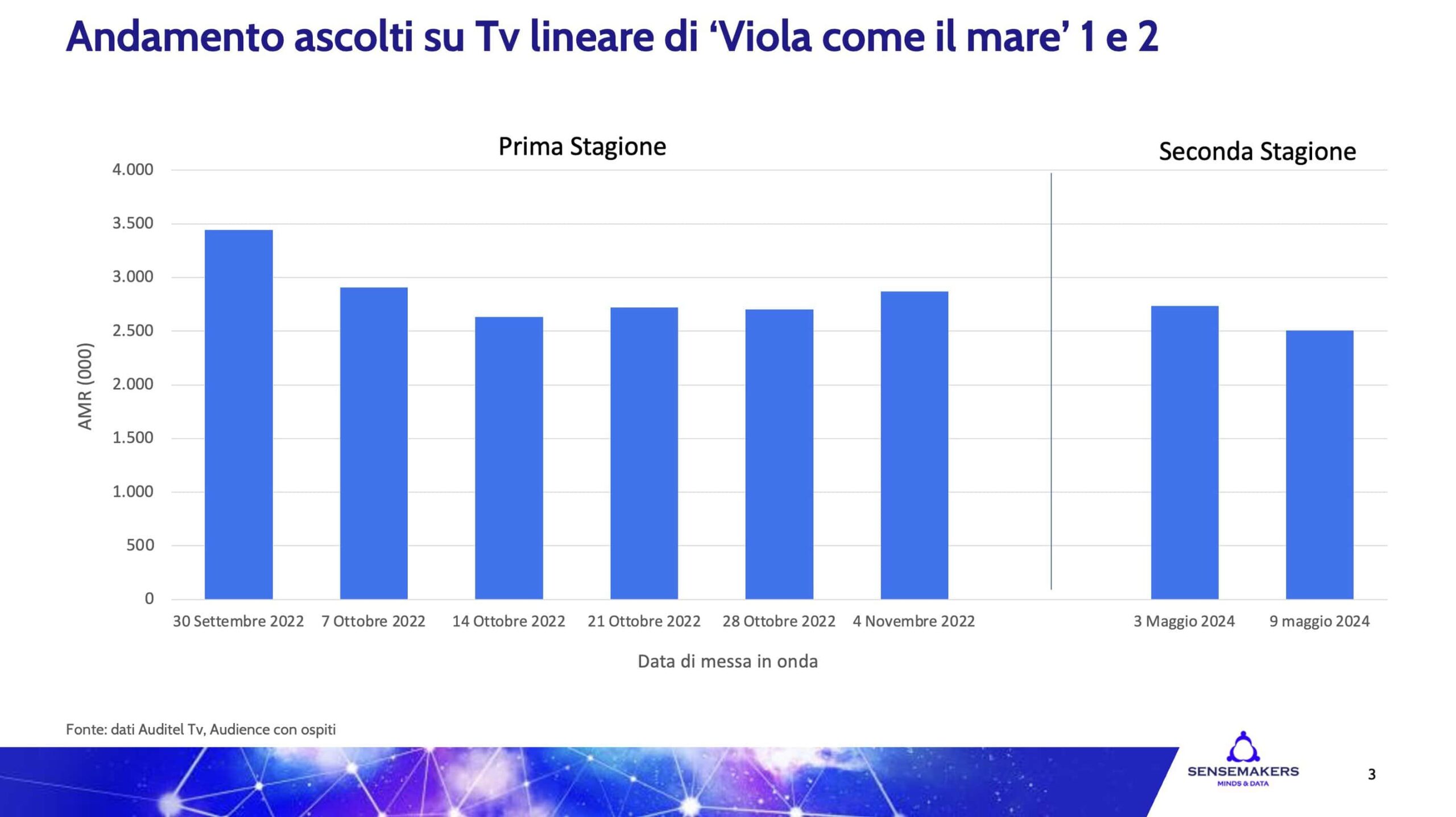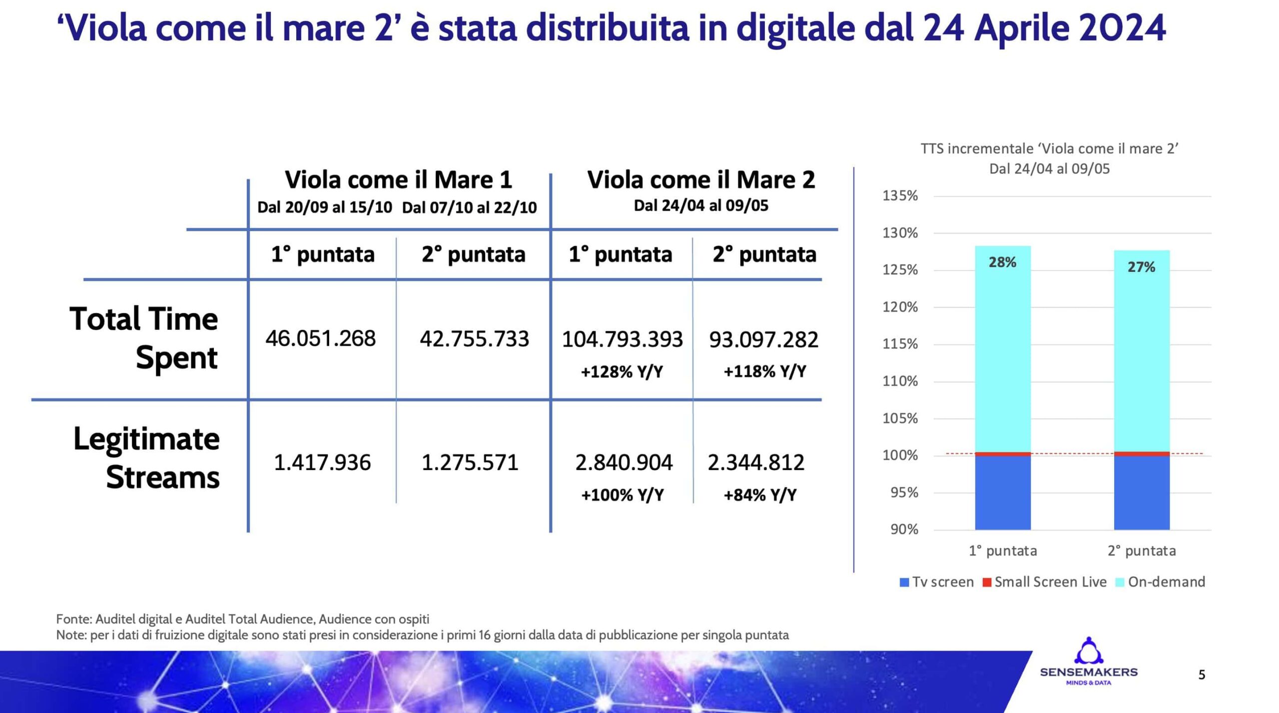 Come già dimostrato dal caso Mare Fuori all’interno dell’ecosistema Rai, anche per Mediaset la scelta della distribuzione digital-first del prodotto fiction non solo si configura come segno di innovazione, ma si rivela altresì un metodo efficace per ampliare il successo della propria offerta. Inoltre, il rilascio in anteprima streaming della seconda stagione di Viola come il mare non ha compromesso la messa in onda tradizionale su Canale 5, confermando il duplice impatto positivo di questa nuova strategia. Osservando i risultati d’ascolto linear delle prime due puntate (media AMR 2 milioni 620 mila spettatori) si nota infatti come questi siano in linea con quelli raggiunti dalla prima stagione trasmessa nell’autunno 2022 (media AMR: 2 milioni 879 mila).