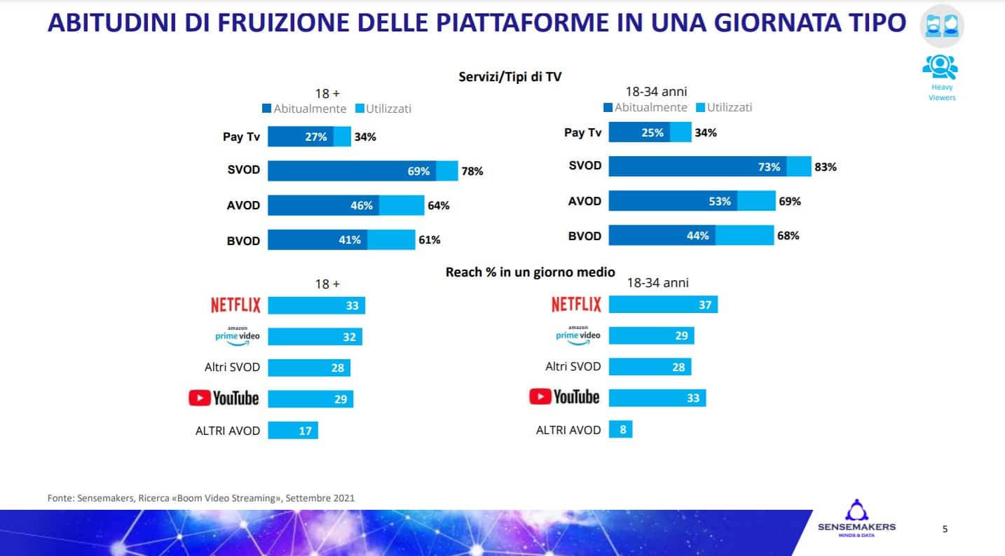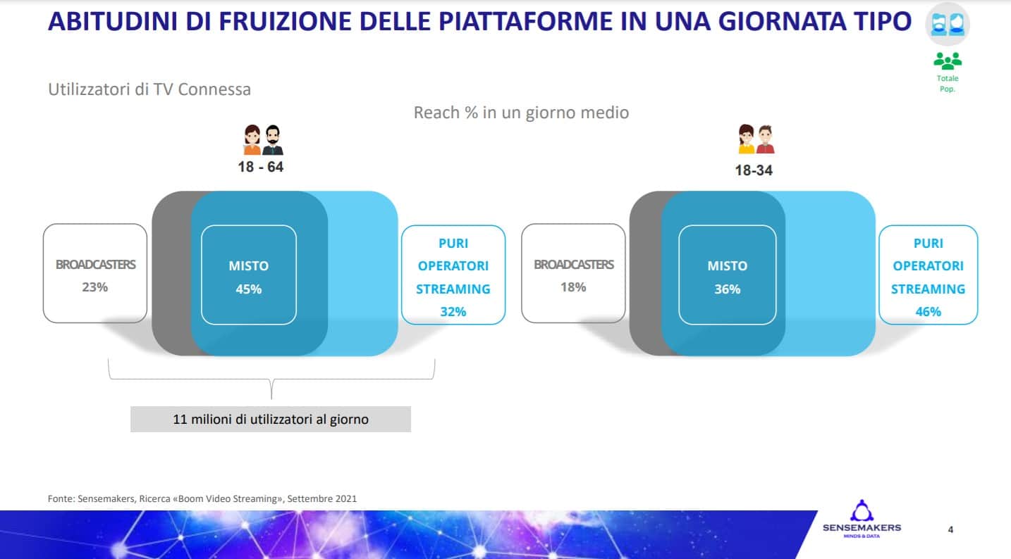 Gli heavy user medi giornalieri, fruitori di contenuti video attraverso la CTV, sono circa 11 milioni e il 32%  di questi visualizza solamente contenuti di puri operatori streaming a fronte di un 45% con una fruizione  mista (broadcaster e puri operatori streaming) e di un 23% esclusivi broadcaster.