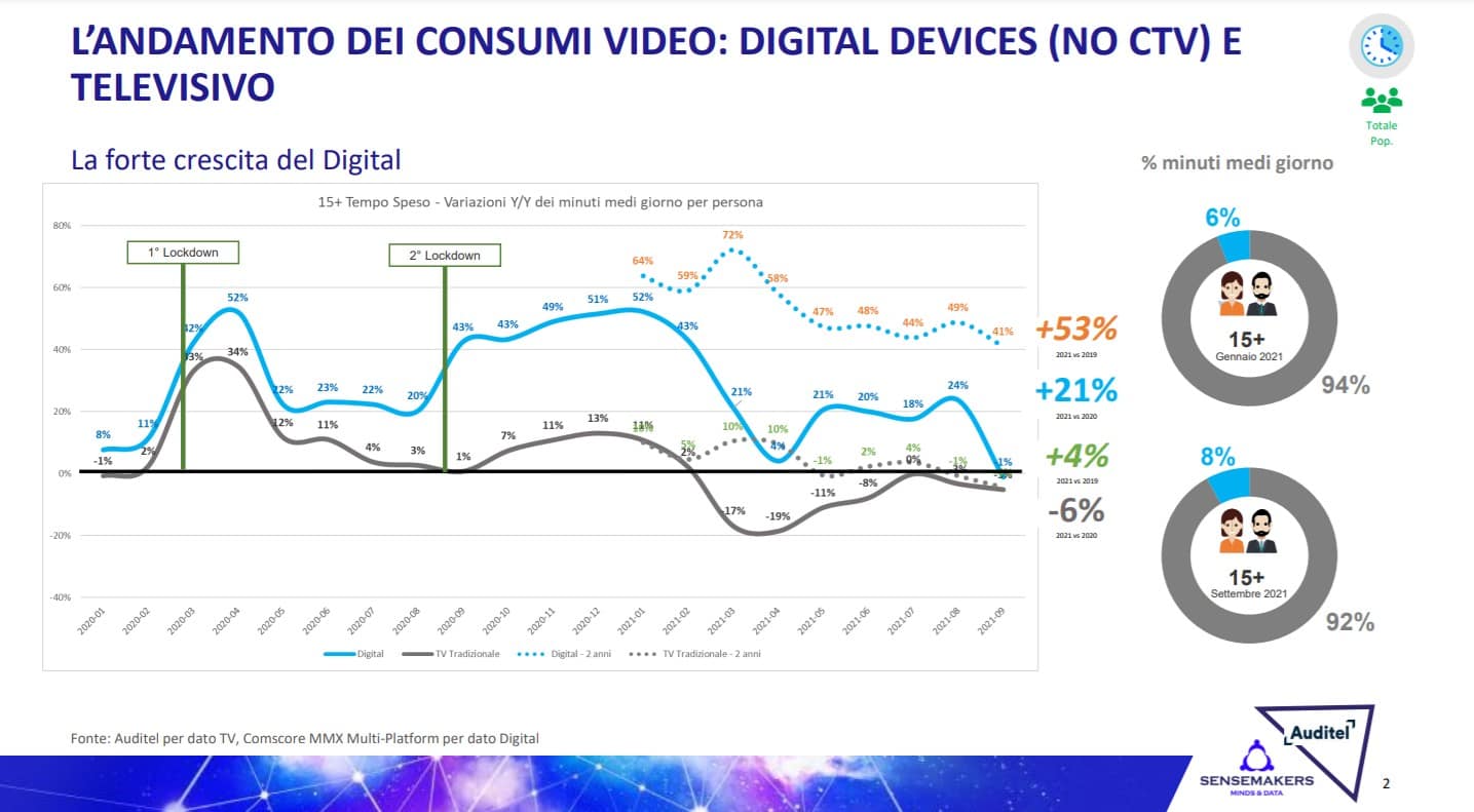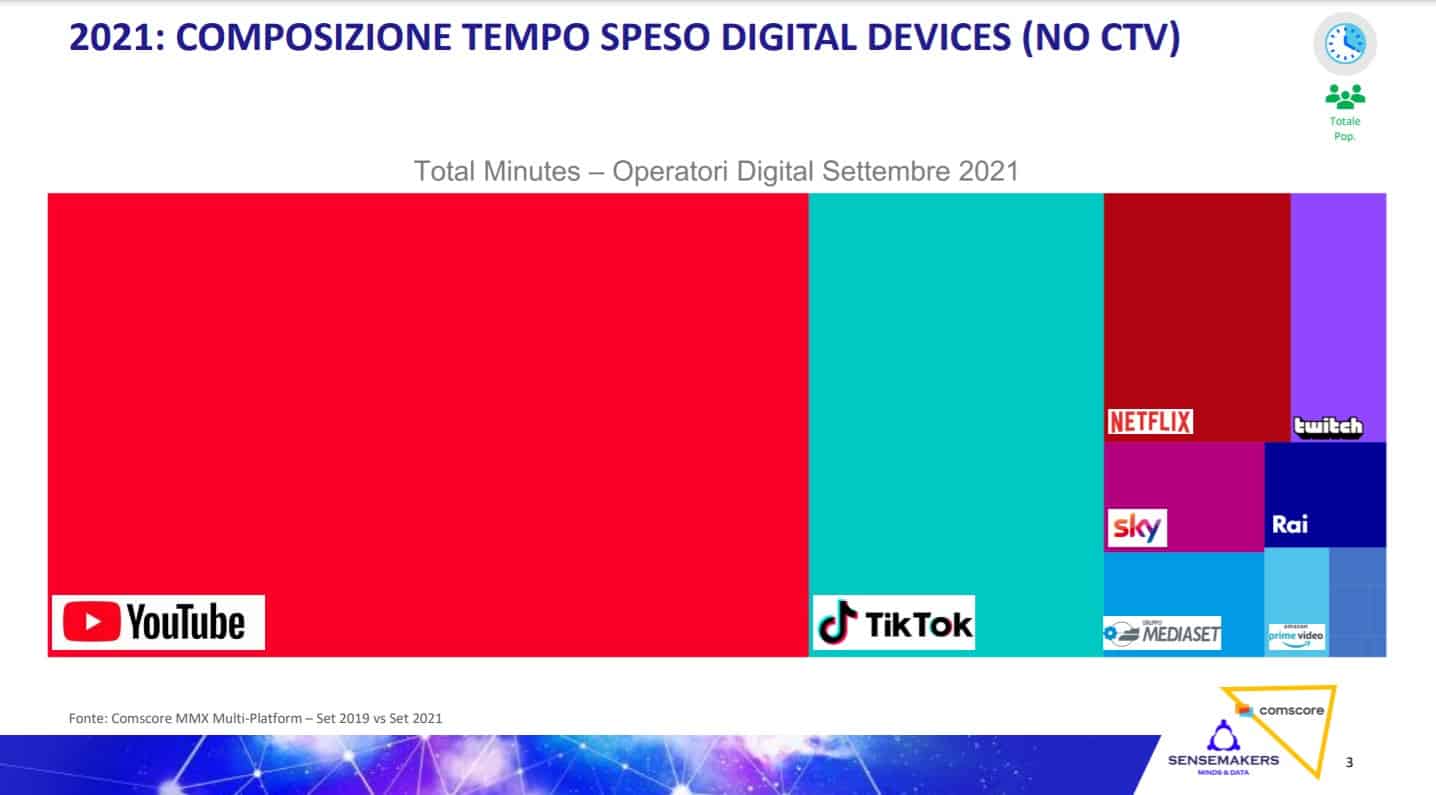 Nei primi nove mesi del 2021 il tempo speso nel consumo di video sui device digitali (smartphone, tablet, pc) rispetto allo stesso periodo del 2020 è cresciuto del +21%  concentrandosi sui player digitali, sia storici che nuovi (90% del tempo speso sulle property dei  player video a settembre è trascorso su YouTube, TikTok, Netflix e Twitch).