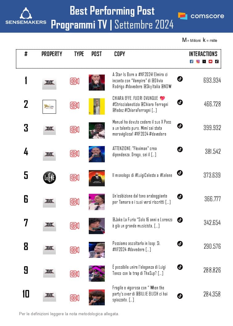 È interessante notare come i primi due programmi per interazioni siano confermati anche per le visualizzazioni video. In particolare, XFactor, tornato in onda il 12 settembre con un cast di giudici e una presentatrice completamente rinnovati, si sta rivelando un successo sui social, come dimostrato dalla classifica dei contenuti più performanti del mese. Anche Verissimo, che ha riaperto lo studio il 7 settembre, è tornato a crescere sulle piattaforme. Tuttavia, i numeri di XFactor sono impressionanti, con quasi 220 milioni di visualizzazioni, nettamente sopra gli altri programmi. Di queste, l’80% proviene da TikTok, con il video più visto che ha per protagonista la giovanissima concorrente Elmira.