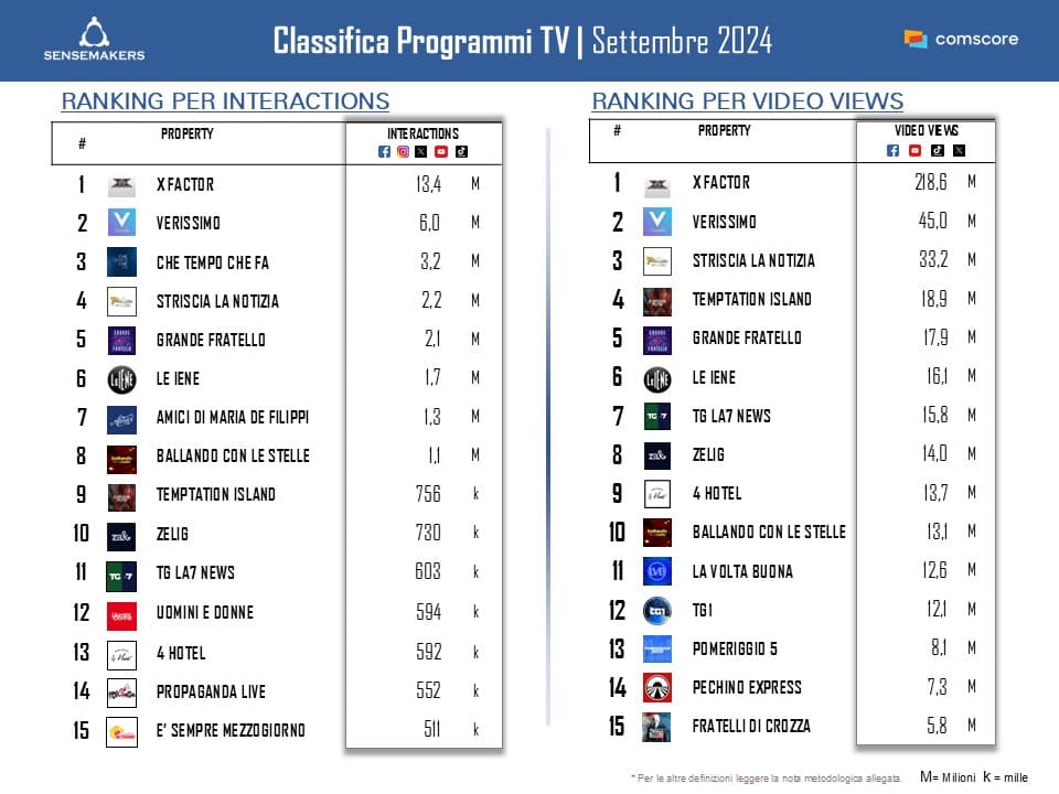La classifica Top 15 Programmi Tv del mese di settembre vede una doppia vista per interazioni e per video views.