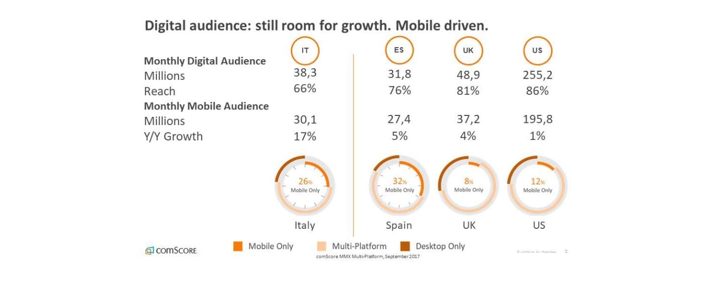 In occasione dell’evento IAB Forum 2017 Fabrizio Angelini, country manager di comScore Italia ha presentato una serie di dati relativi all’attuale scenario digitale mettendo a confronto Italia e altri paesi nel mondo.