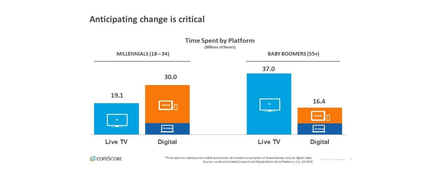 I millennials (18 – 34) spendono la maggior parte del tempo totale sulle piattaforme digitali a discapito della Live TV, al contrario i baby boomers (55+), sono ancora più legati alla TV tradizionale rispetto ai dispositivi digitali.