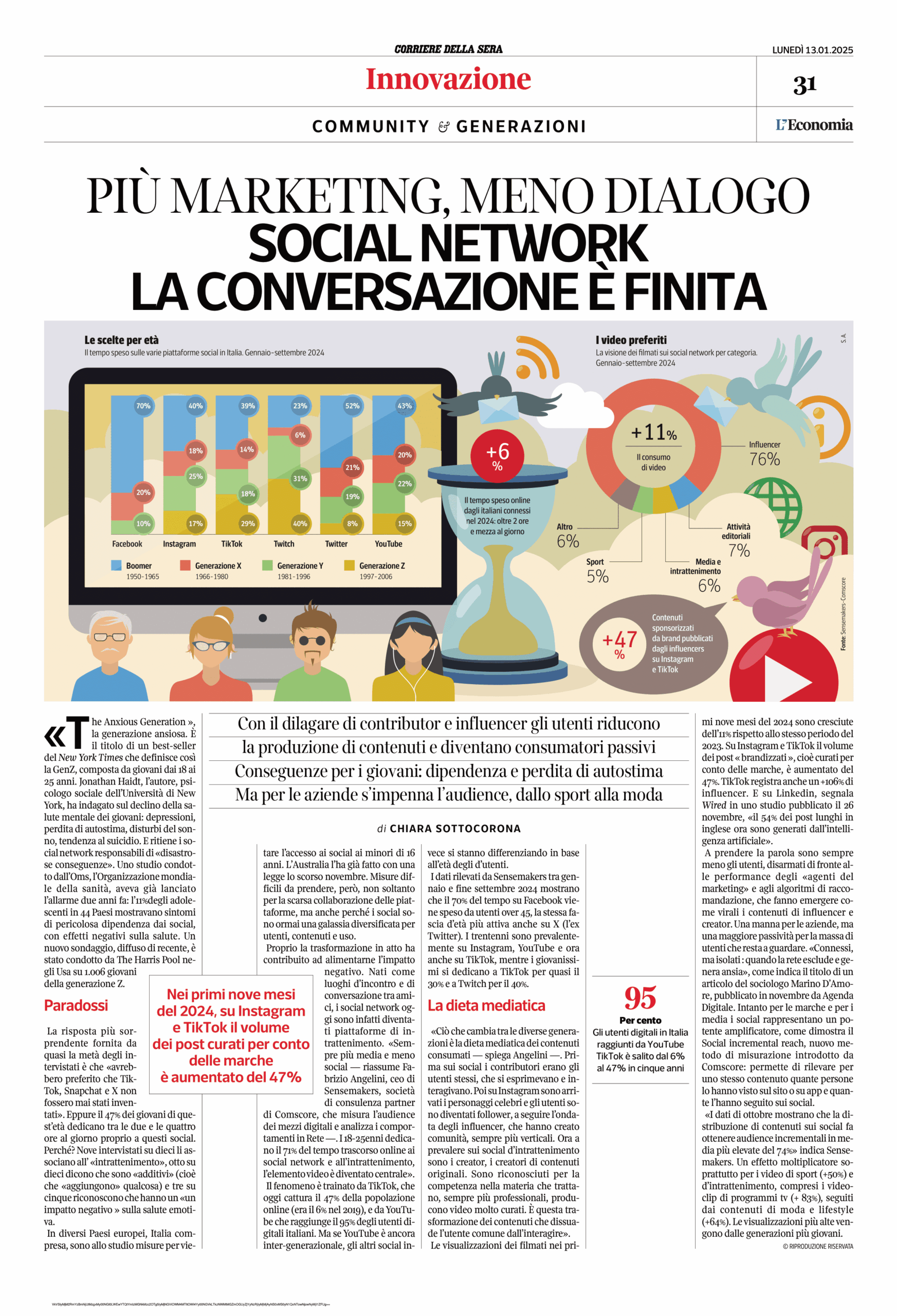 Sensemakers viene menzionata più volte come fonte dei dati chiave sull’evoluzione delle abitudini digitali: il CEO Fabrizio Angelini spiega come i giovani dedichino il 71% del loro tempo online ai social e come l’elemento video sia ormai dominante.