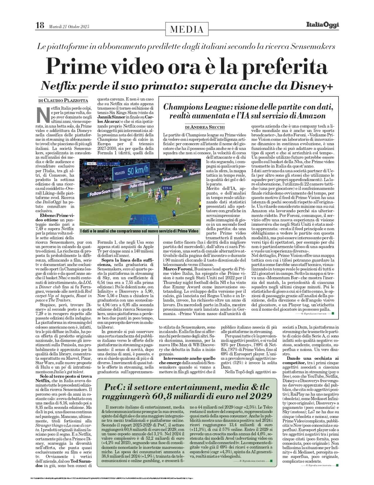 Sensemakers è citata come autrice della ricerca sull’“Overall Liking” delle piattaforme SVOD, che mostra come Prime Video abbia superato Netflix per apprezzamento complessivo del pubblico italiano.