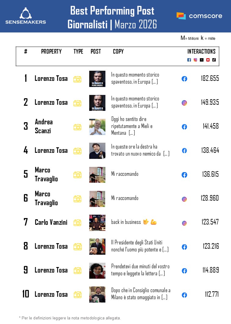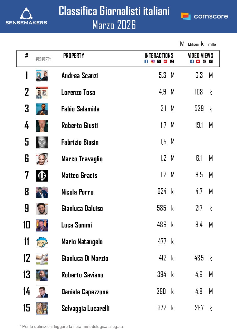 Ora disponibile la classifica dei Top 15 giornalisti italiani più social a marzo, elaborata da Sensemakers in collaborazione con Prima Comunicazione, sulla base dei dati Comscore Social.
