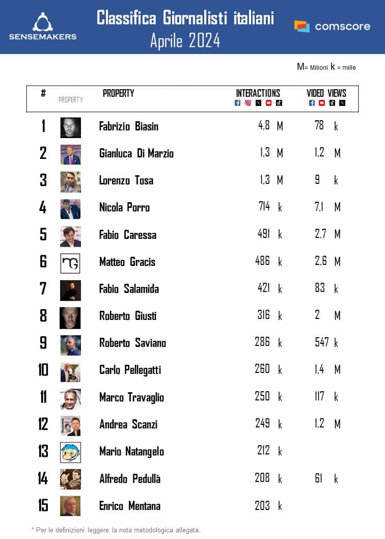 Pubblicata la classifica dei Top 15 giornalisti italiani più social a aprile, elaborata da Sensemakers in collaborazione  con Prima Online sulla base dei dati Comscore Shareablee rilevati monitorando interazioni video views sulle principali piattaforme social (FacebookInstagramTikTok, TwitterYouTube).