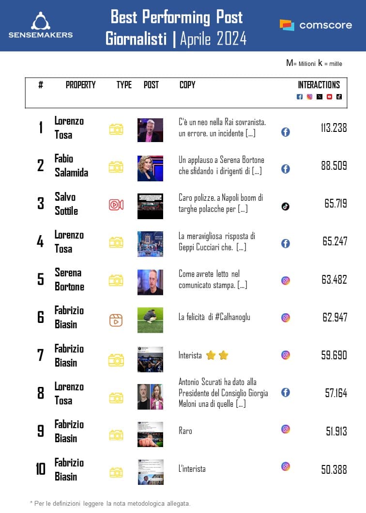Nel ranking delle Top 10 Best Performing Post oltre alle consuete penne di Biasin e Tosa, il ranking vede l’ingresso anche di un nuovo volto del giornalismo televisivo, quello di Serena Bortone, conduttrice Rai che ha fatto molto parlare di sé per aver letto il monologo di Scurati sul 25 aprile per suo conto in diretta tv. Il post della conduttrice che entra in classifica al quinto posto denuncia proprio l’assenza inaspettata dal suo programma della partecipazione di Scurati. Episodio che viene ripreso anche nei contenuti presenti nel ranking e pubblicati dai giornalisti Salamida e Tosa.