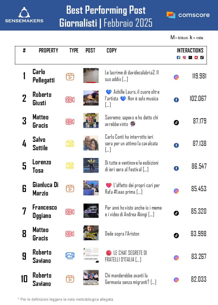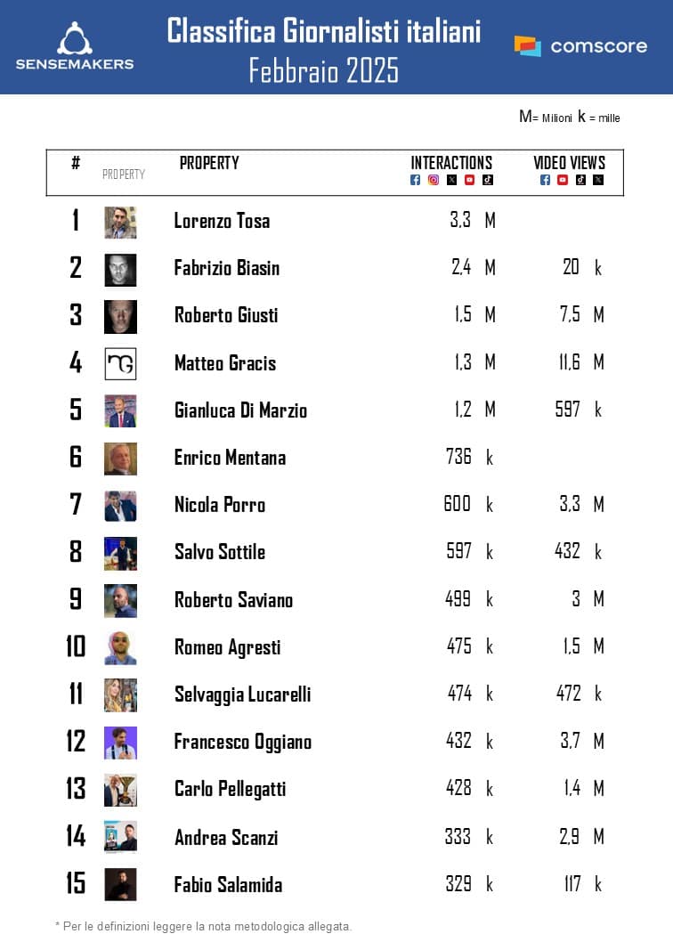 Pubblicata la classifica dei Top 15 giornalisti italiani più social a febbraio, elaborata da Sensemakers in collaborazione con Prima Comunicazione, sulla base dei dati Comscore Social rilevati monitorando interazioni e video views sulle principali piattaforme social (Facebook, Instagram, TikTok, X, YouTube).