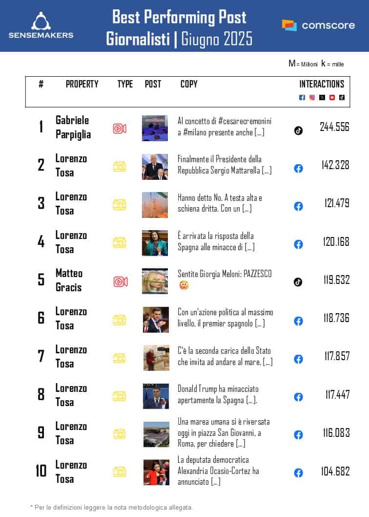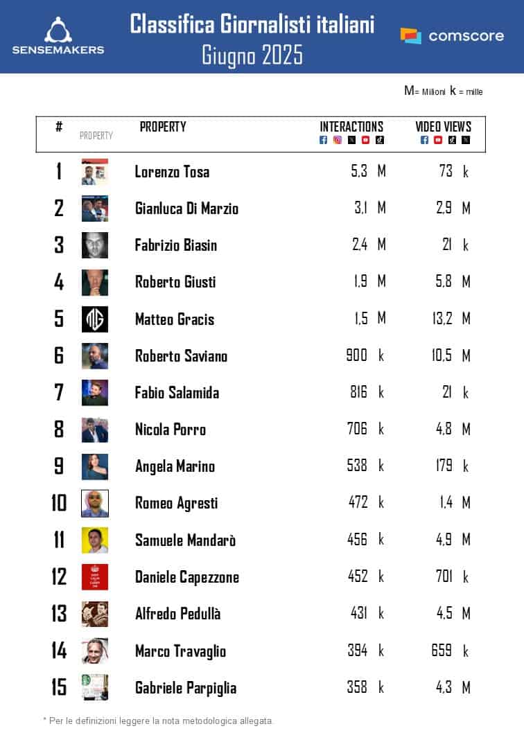 Pubblicata la classifica dei Top 15 giornalisti italiani più social a giugno, elaborata da Sensemakers in collaborazione  con Prima Online sulla base dei dati Comscore Shareablee rilevati monitorando interazioni video views sulle principali piattaforme social (FacebookInstagramTikTok, TwitterYouTube).