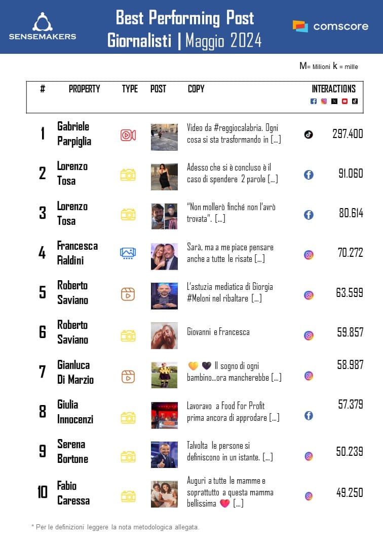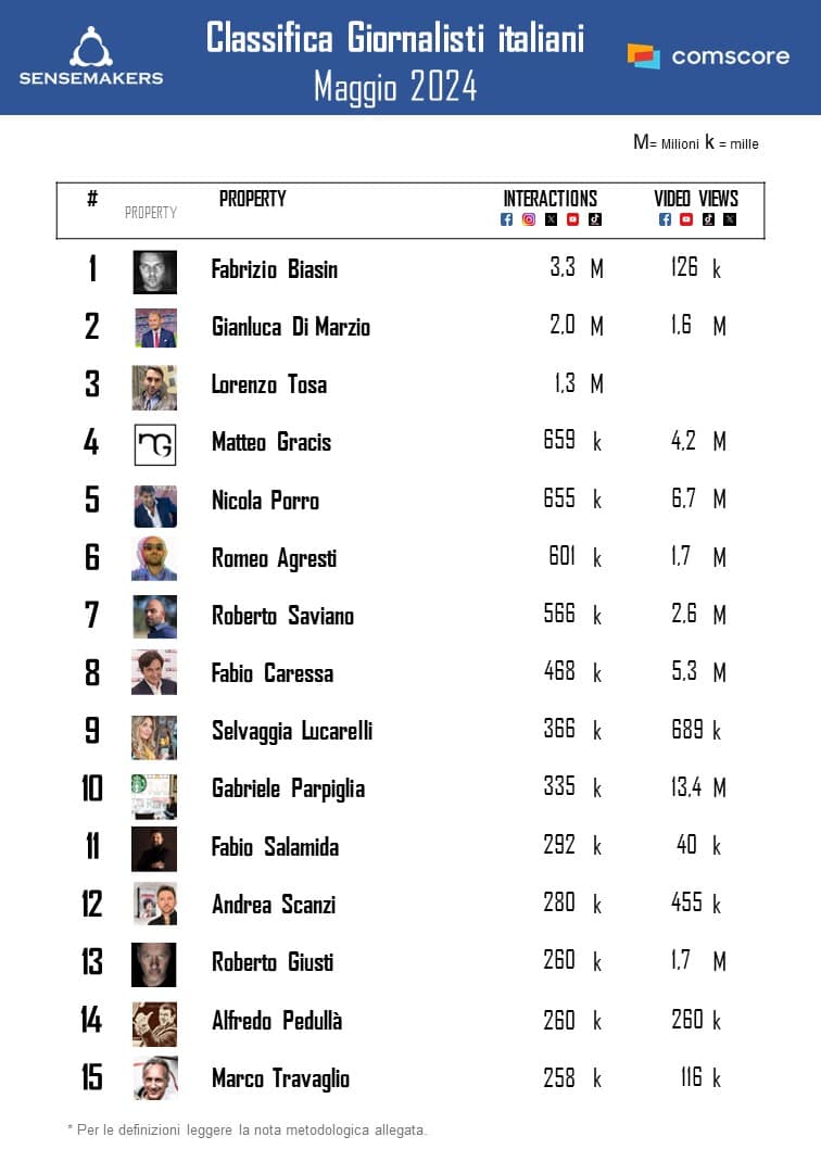 Pubblicata la classifica dei Top 15 giornalisti italiani più social a maggio, elaborata da Sensemakers in collaborazione con Prima Online sulla base dei dati Comscore Shareablee rilevati monitorando interazioni e video views sulle principali piattaforme social (Facebook, Instagram, TikTok, Twitter, YouTube).