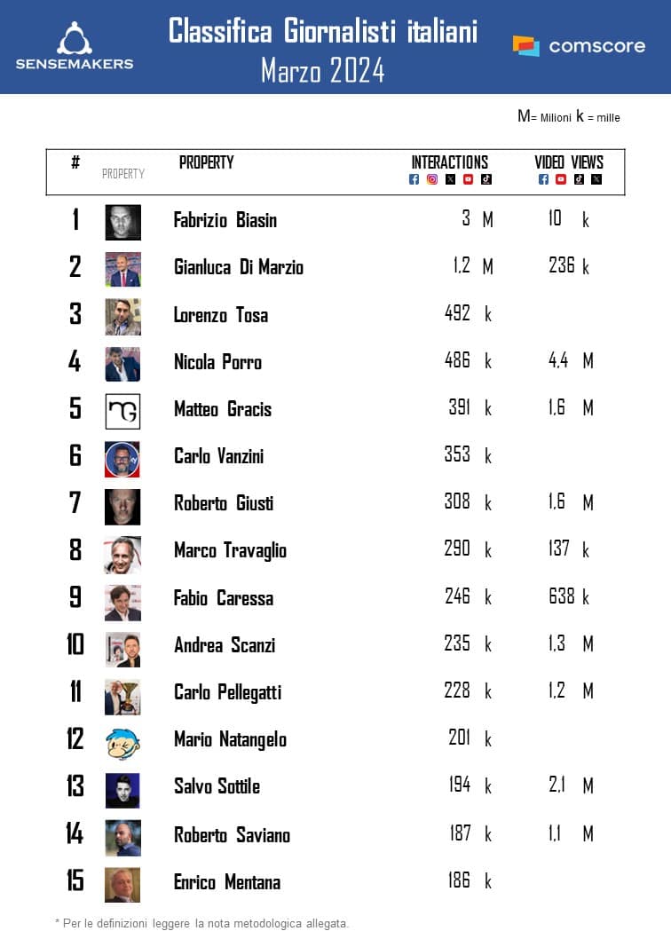 Pubblicata la classifica dei Top 15 giornalisti italiani più social a marzo, elaborata da Sensemakers in collaborazione  con Prima Online sulla base dei dati Comscore Shareablee rilevati monitorando interazioni video views sulle principali piattaforme social (FacebookInstagramTikTok, TwitterYouTube).