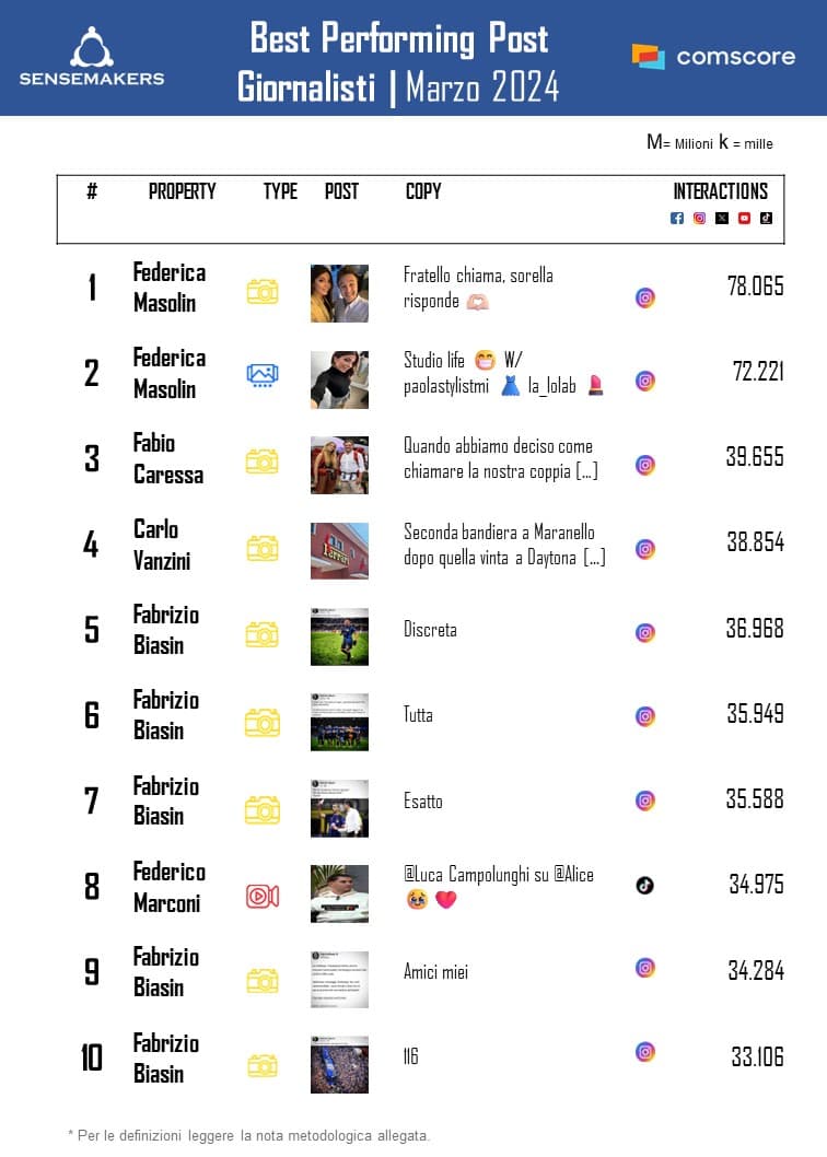 Nella Top 10 best performing post dominano i giornalisti sportivi.