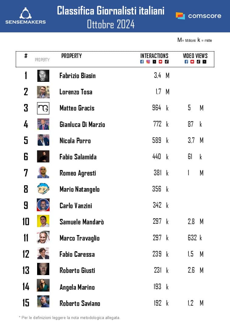 Pubblicata la classifica dei Top 15 giornalisti italiani più social a ottobre, elaborata da Sensemakers in collaborazione  con Prima Online sulla base dei dati Comscore Shareablee rilevati monitorando interazioni video views sulle principali piattaforme social (FacebookInstagramTikTok, TwitterYouTube).