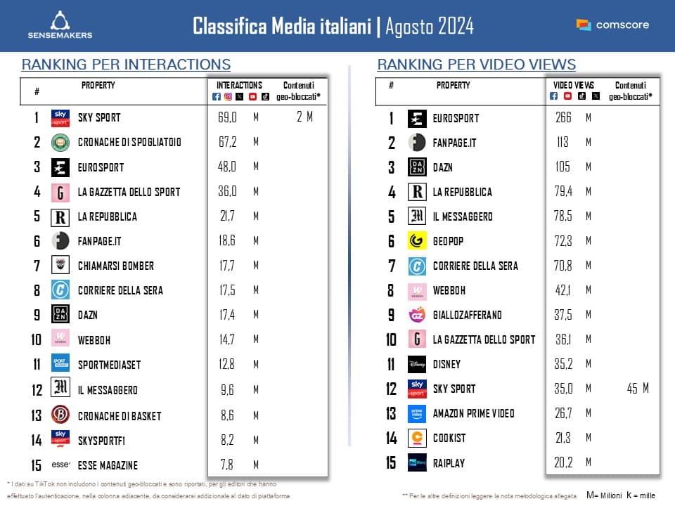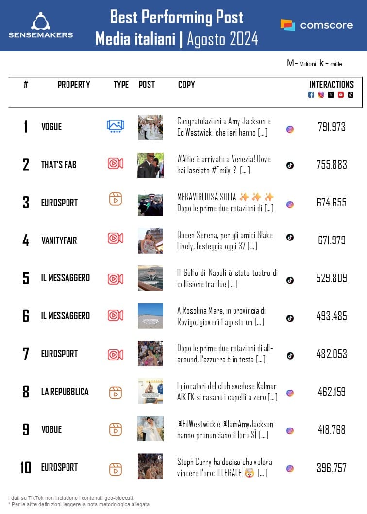 I media sportivi restano in testa con il sorpasso di Sky Sport su Cronache di Spogliatoio e con Eurosport nella stessa posizione del mese scorso ma con numeri in decisa crescita tanto per interazioni (+59%) quanto per video views, dove supera il risultato outstanding registrato il mese scorso. Le Olimpiadi di Parigi 2024 sono state sicuramente un boost importante di cui anche Sky Sport si è resa protagonista, grazie anche ad un aumento trasversale di pubblicazioni e di engagement su tutte le piattaforme, tra le quali Instagram primeggia con oltre 4.200 interazioni a post.
