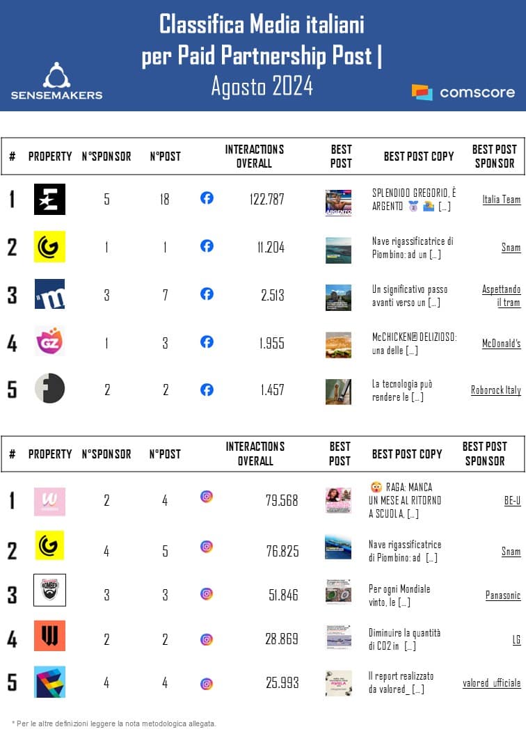 Top Media Italiani per Paid Partnership Post a agosto