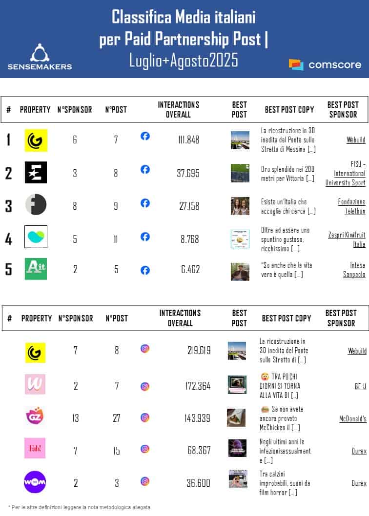 Top Media Italiani per Paid Partnership Post a Luglio e Agosto