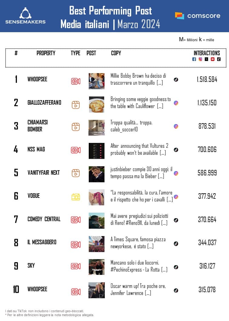 Whoopsee e Chiamarsi Bomber si confermano nella classifica al fianco del ritorno di Giallozafferano, al secondo posto, e le testate giornalistiche di Condé Nast, Vogue e VanityFair. Il ranking dei contenuti più performanti lascia spazio al mondo del Food, Fashion e delle News, con una minore presenza del mondo sportivo, con il solo Chiamarsi Bomber presente nel ranking.