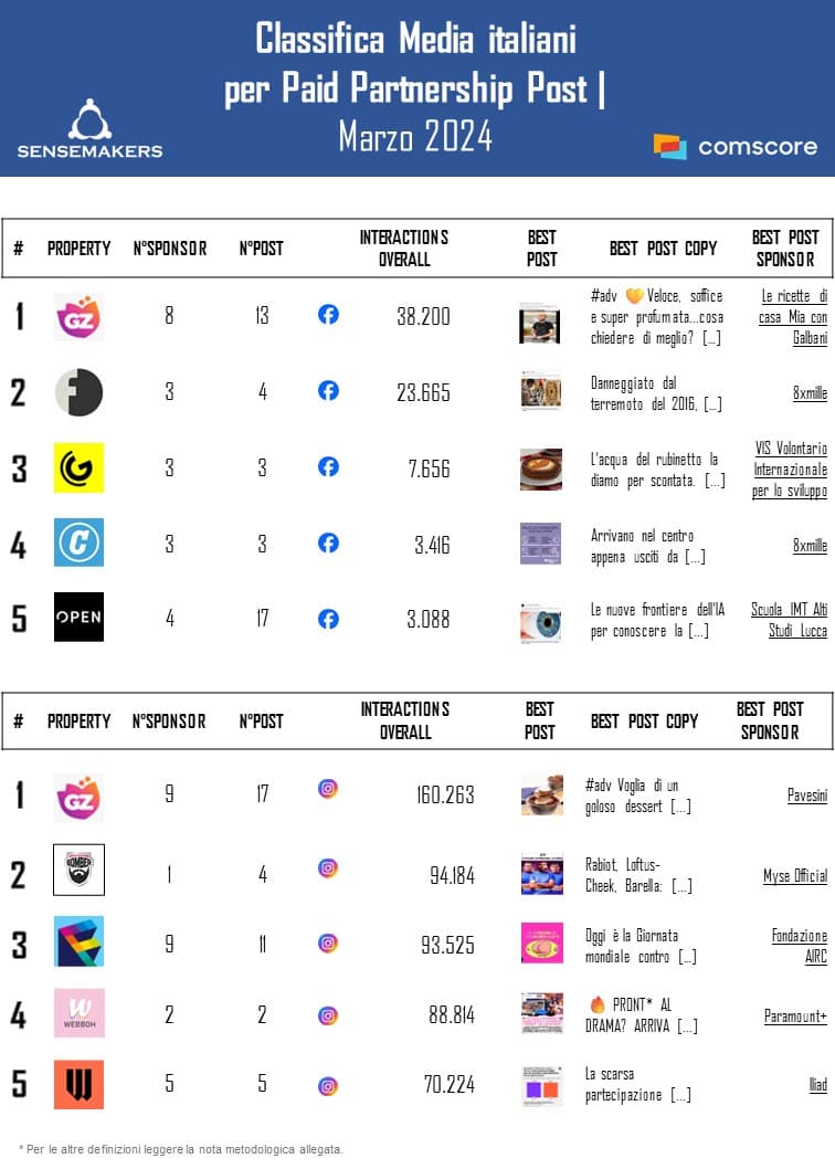 Classifica dei Top Media Italiani per Paid Partnership Post per interazioni sui soli contenuti brandizzati pubblicati nel mese di riferimento. I contenuti brandizzati sono i contenuti che presentano un partner commerciale e riportano questa informazione tramite uno specifico tag.