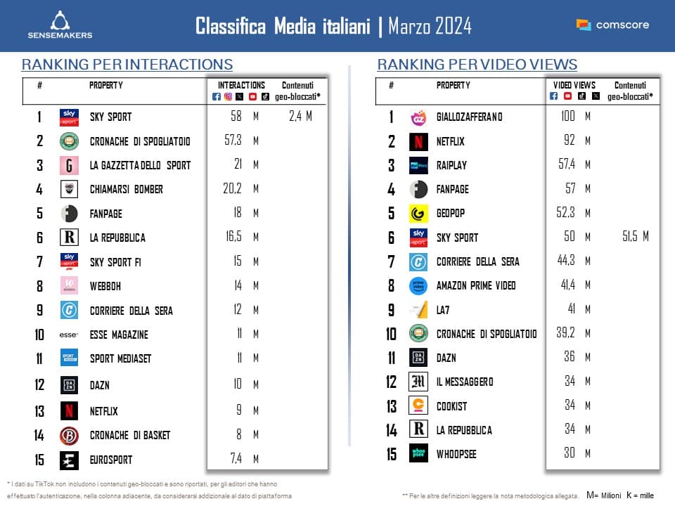 Le crescite delle testate sportive, che continuano sempre a occupare la maggior parte dei posizionamenti in classifica (9 su 15), hanno come contraltare un calo dei volumi delle testate d’informazione generalista come Fanpage (- 17%), La Repubblica (-22%) e Corriere della Sera (-25%), dopo il mese sanremese.