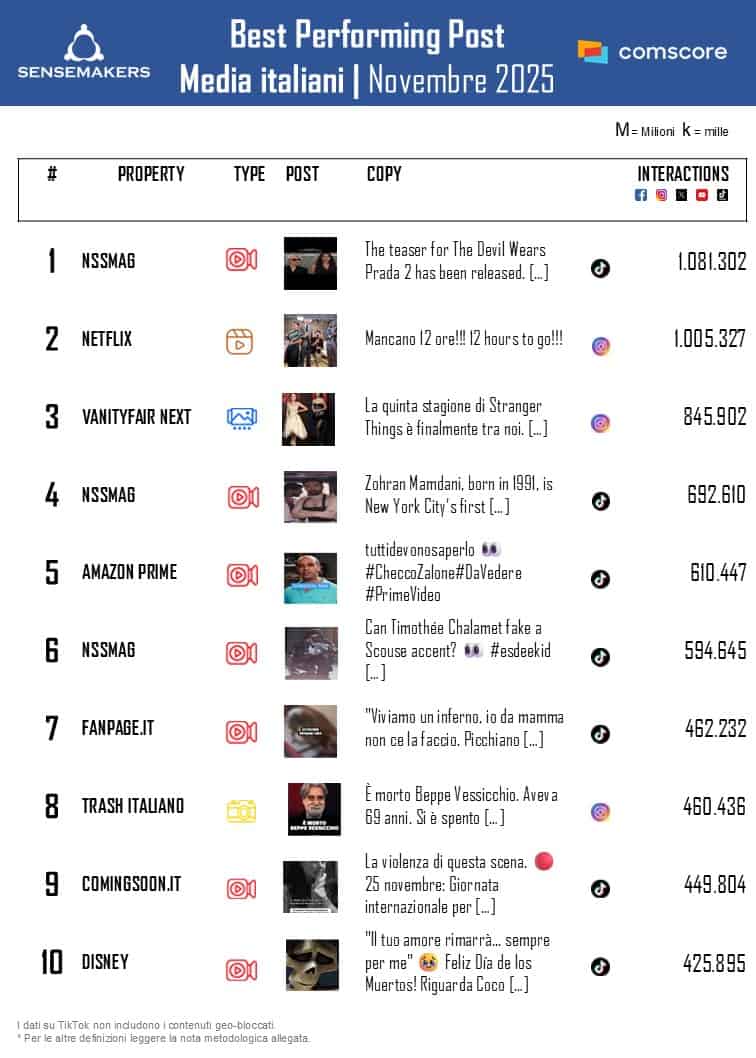Pur non figurando nel ranking per numero complessivo di interazioni, Nssmag apre la classifica dei Top 10 Best Performing Post grazie alla ricondivisione del teaser de “Il Diavolo Veste Prada 2”, che ha superato il milione di interazioni. Un singolo contenuto che da solo concentra il 17% dell’engagement mensile totale del magazine.
