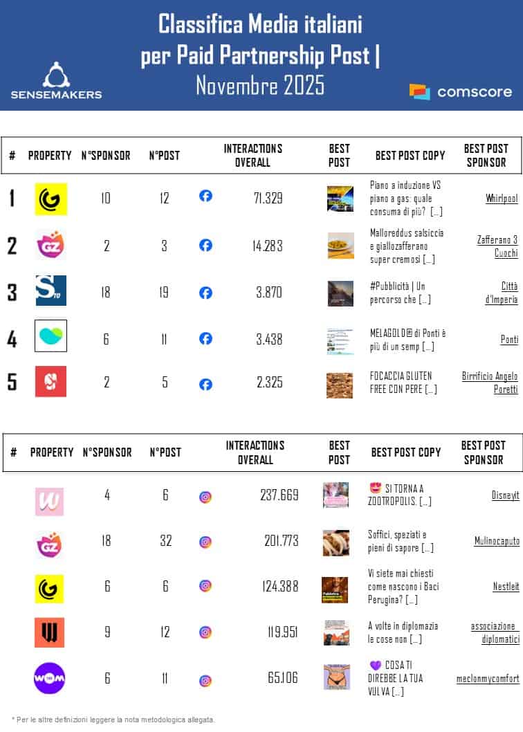 Classifica dei Top Media Italiani per Paid Partnership Post per interazioni sui soli contenuti brandizzati pubblicati nel mese di riferimento. I contenuti brandizzati sono i contenuti che presentano un partner commerciale e riportano questa informazione tramite uno specifico tag.