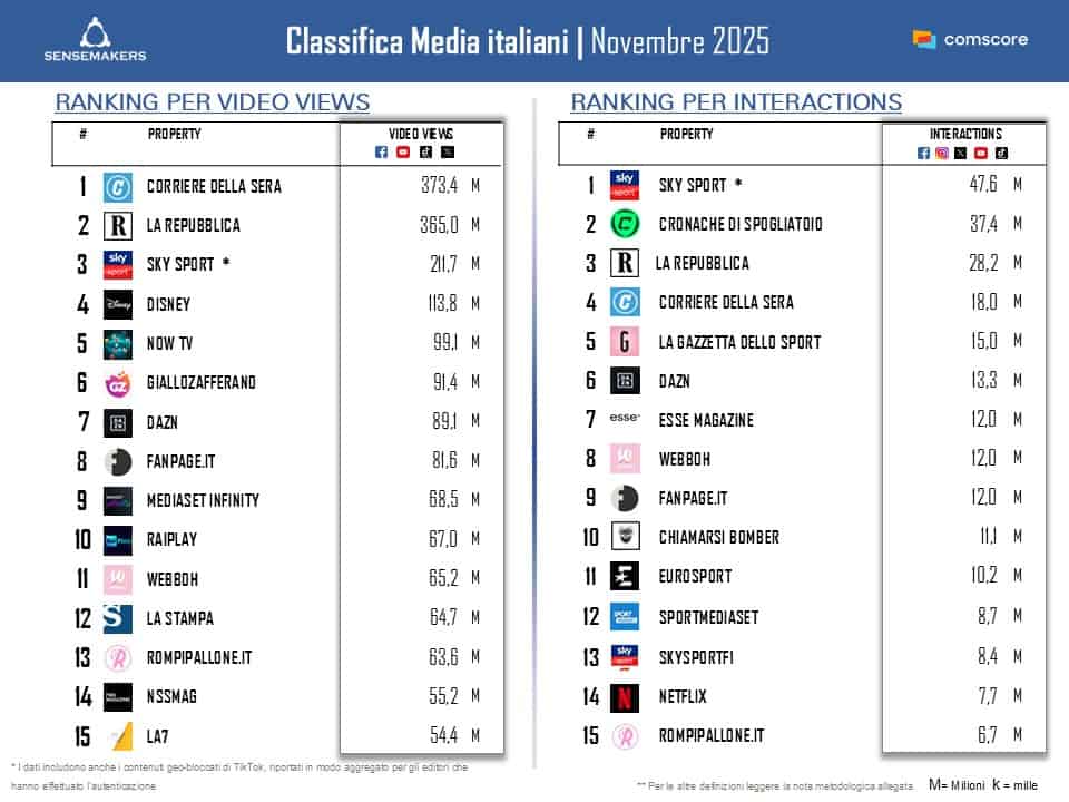 La classifica dei Top 15 Media Italiani di novembre presenta volumi in leggero calo sia sul lato delle video views (-8%) che su quello delle interazioni (-12%).