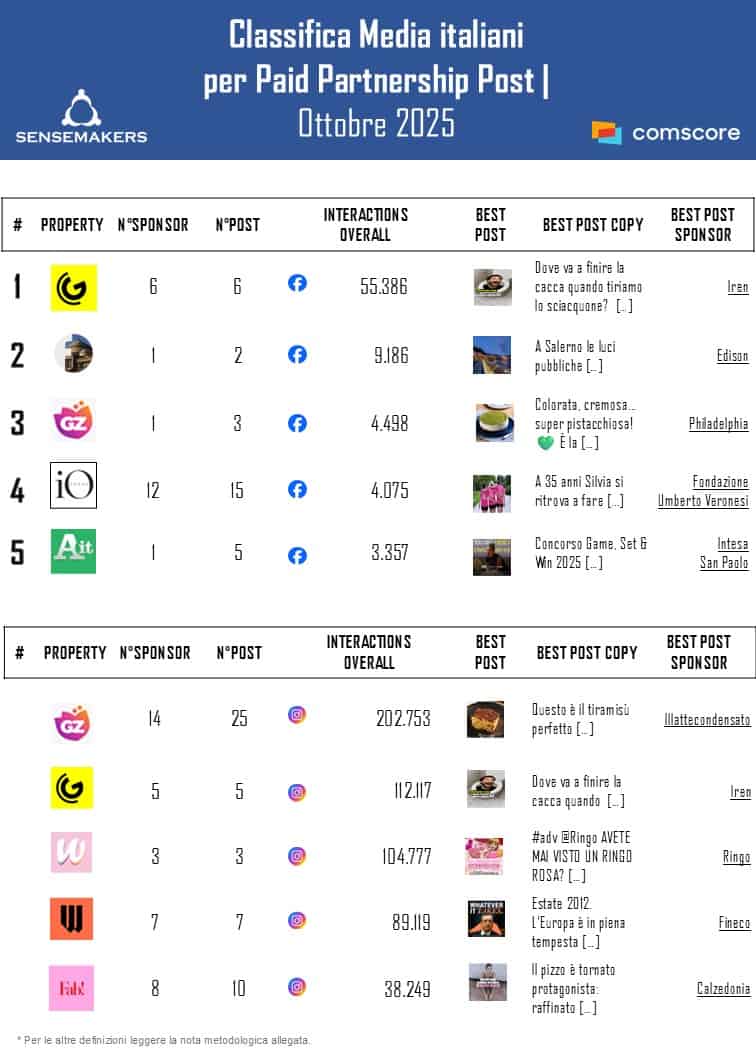 Classifica dei Top Media Italiani per Paid Partnership Post per interazioni sui soli contenuti brandizzati pubblicati nel mese di riferimento. I contenuti brandizzati sono i contenuti che presentano un partner commerciale e riportano questa informazione tramite uno specifico tag.