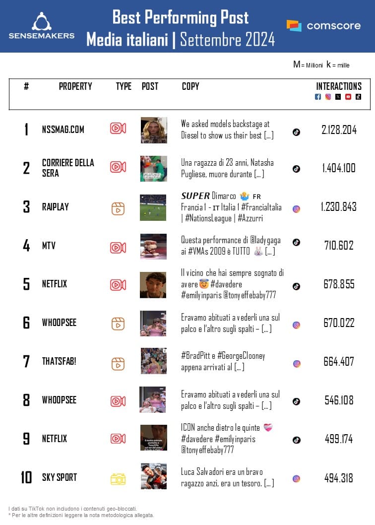 Nella Top10 best performing post del mese di settembre forse per la prima volta non compaiono contenuti sportivi ad eccezione del contenuto di Sky Sport sulla scomparsa del motociclista Luca Salvadori. Nel mese vengono premiati contenuti generalisti o di “cronaca rosa”.