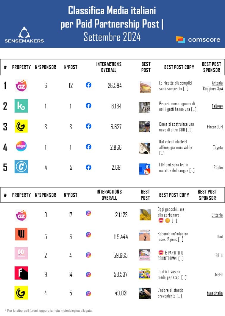 I dati della classifica delle Best Paid Partnership mescolano le carte in tavola sia in termini di sponsor che di editori. Nel ranking di Facebook vengono confermati solo Giallozafferano e Geopop. Interessante l’ingresso del Corriere della Sera. Al contrario, in Instagram, ritroviamo una maggiore continuità negli editori, ad eccezione di Freeda che prende il posto di Factanza e il ritorno di Giallozafferano al primo posto.
