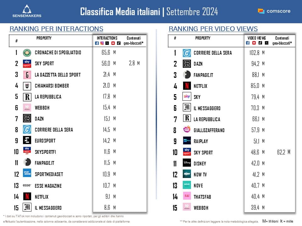 Classifica dei Top Media Italiani per interazioni sui social a settembre