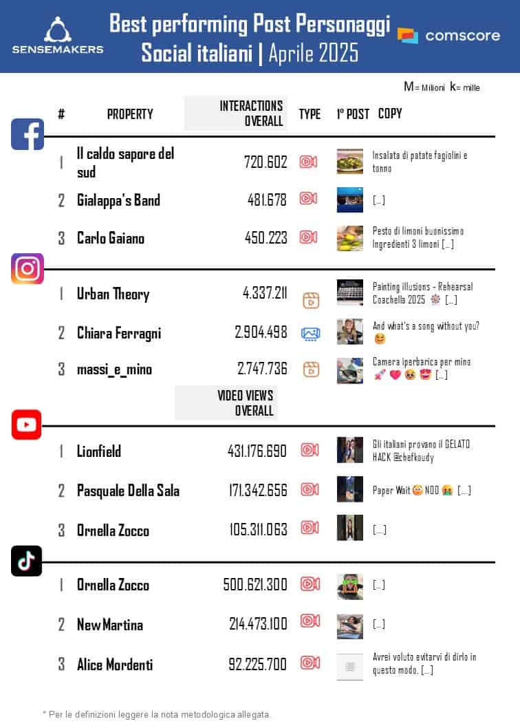 Ora disponibile la classifica dei Top 15 Personaggi social italiani di Aprile, elaborata da Sensemakers in collaborazione con Prima Online, sulla base dei dati Comscore Social rilevati monitorando interazioni video views sulle principali piattaforme social.