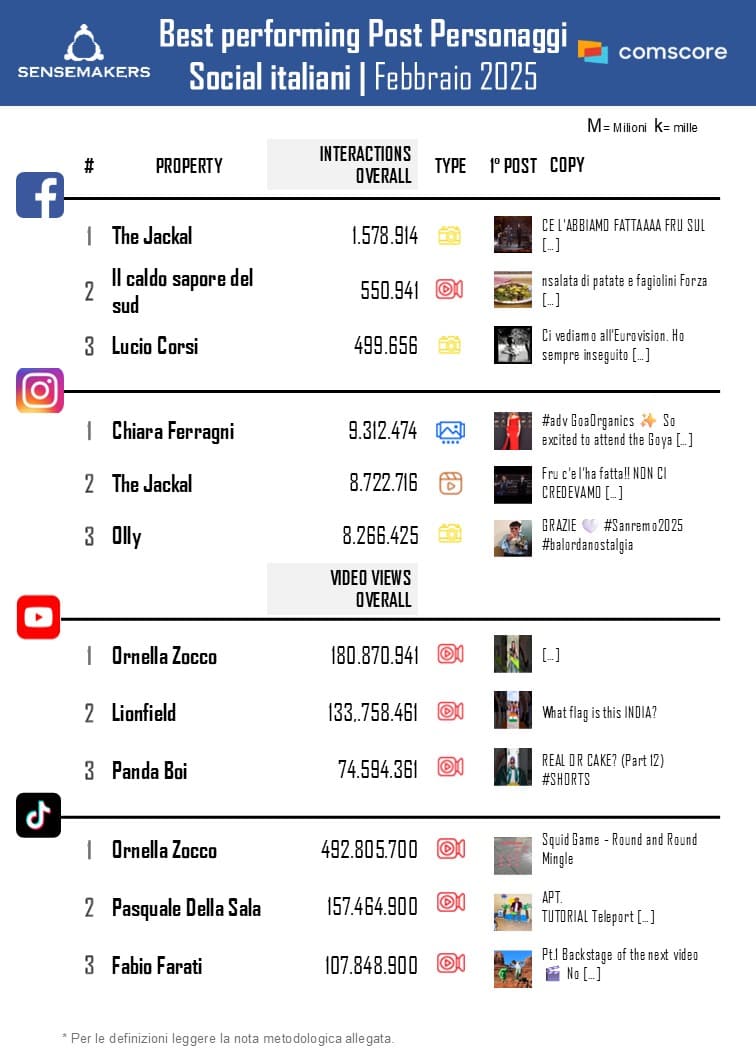 L’influenza del Festival si sente anche nelle altre posizioni del ranking per interazioni con la presenza di Olly, il cui post di ringraziamento dopo la vittoria ha sfiorato il milione di interazioni, accompagnato da Lucio Corsi, Fedez ed Elodie. Si riconferma la presenza di Damiano, il cui post più performante, anche in questo caso, è proprio dedicato alla sua partecipazione come ospite al Festival sanremese.