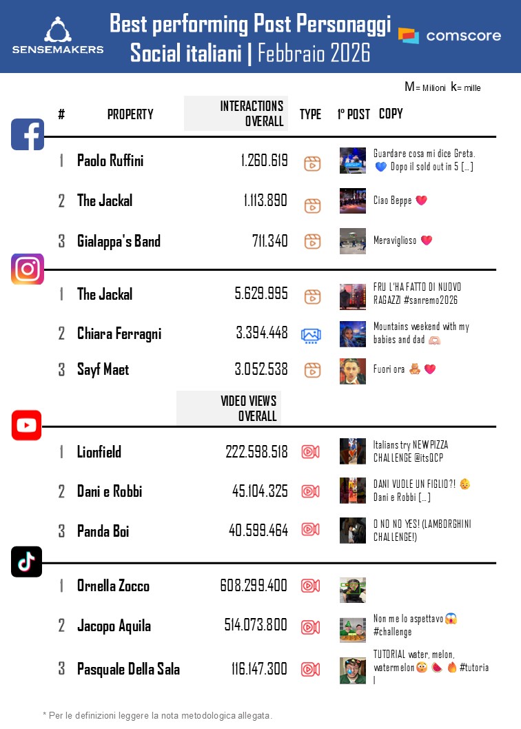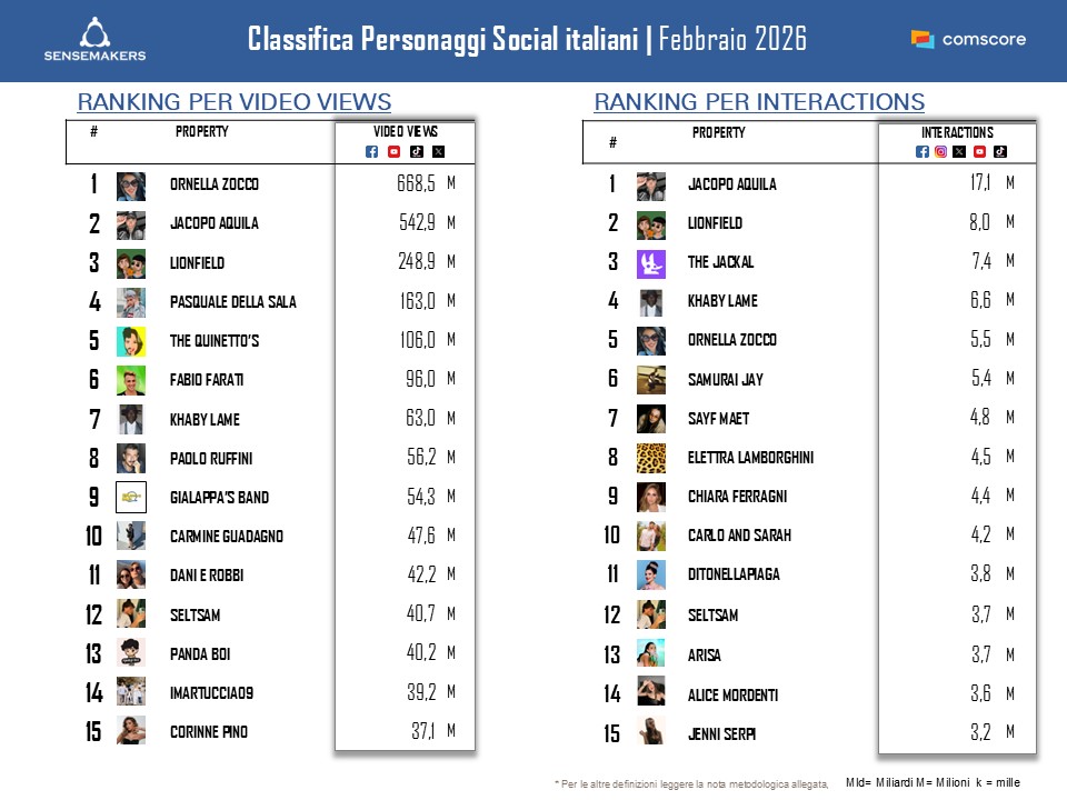 Top 15 Personaggi social italiani, Febbraio 2026