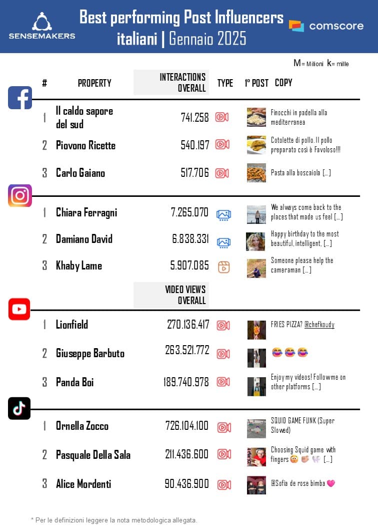 Gennaio offre, inoltre, la prova di quanto i social possano essere meritocratici. Ne è un esempio Ilaria Dentella, presente sia nel ranking per interazioni sia in quello per video views. Pattinatrice professionista, era già attiva sui social, ma senza aver mai raccolto volumi sufficienti per entrare in classifica. A cambiare le cose è stato un video in cui pattina su un lago ghiacciato, con un paesaggio mozzafiato alle spalle. Questo contenuto le ha garantito quasi 6 milioni di interazioni e 63 milioni di video views.