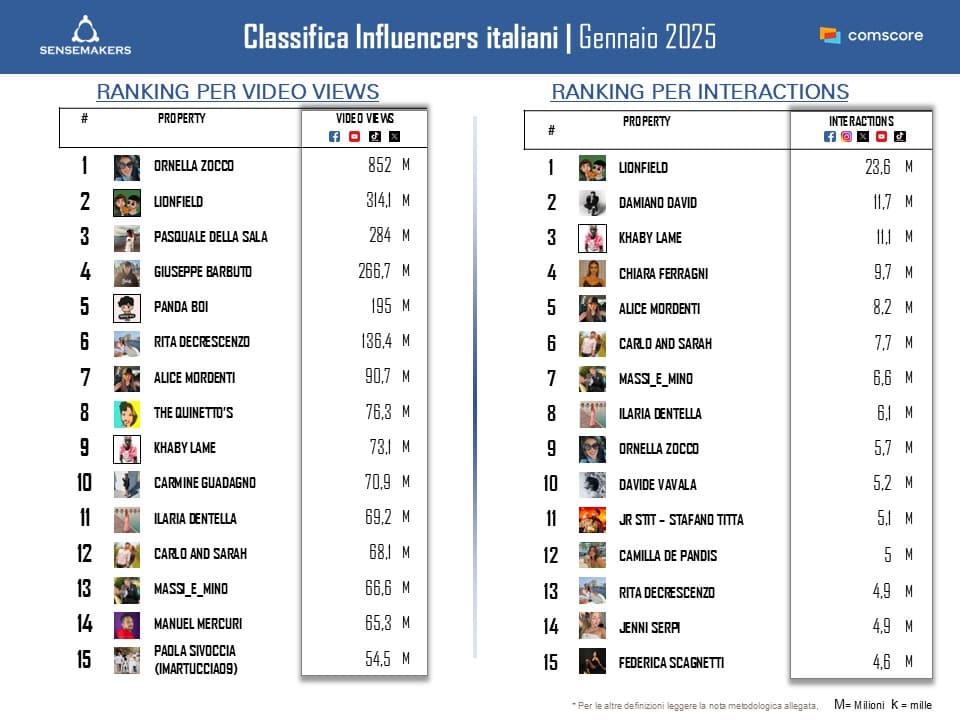 Ora disponibile la classifica dei Top 15 Personaggi social italiani di gennaio, elaborata da Sensemakers in collaborazione con Prima Online, sulla base dei dati Comscore Socialrilevati monitorando interazioni video views sulle principali piattaforme social.